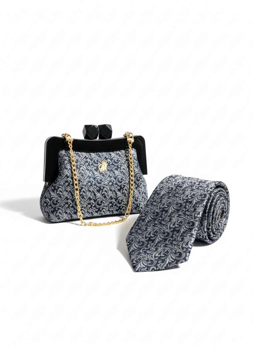 Precioso bolso confeccionado de manera artesanal, en tejido azul brocado.